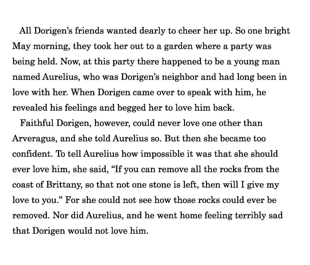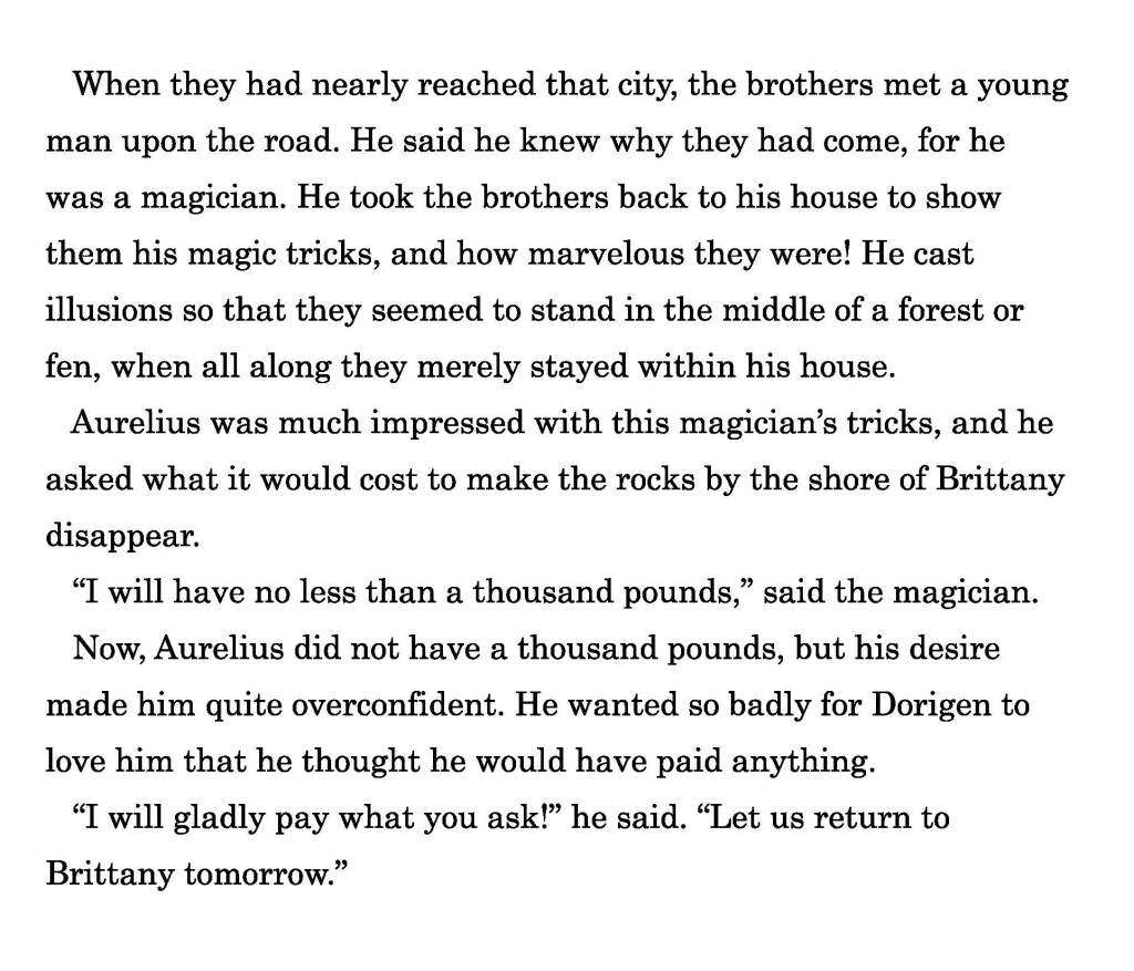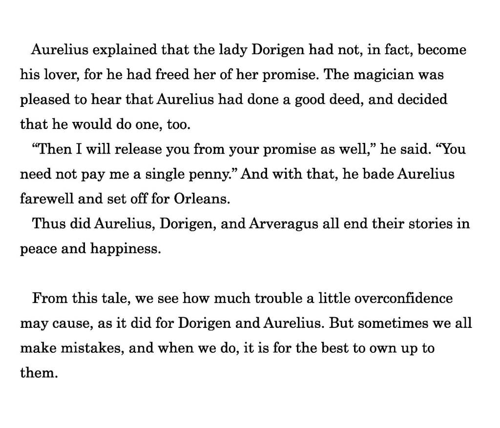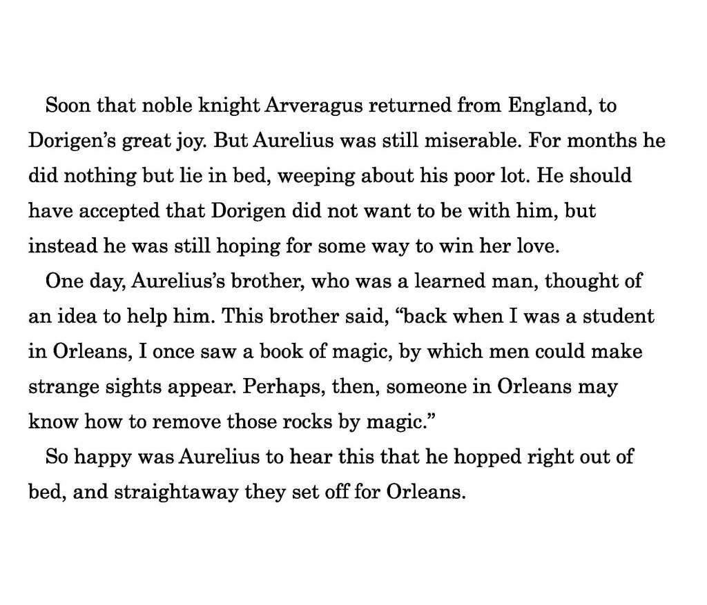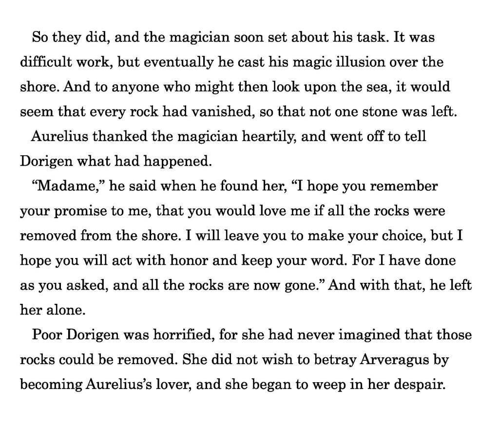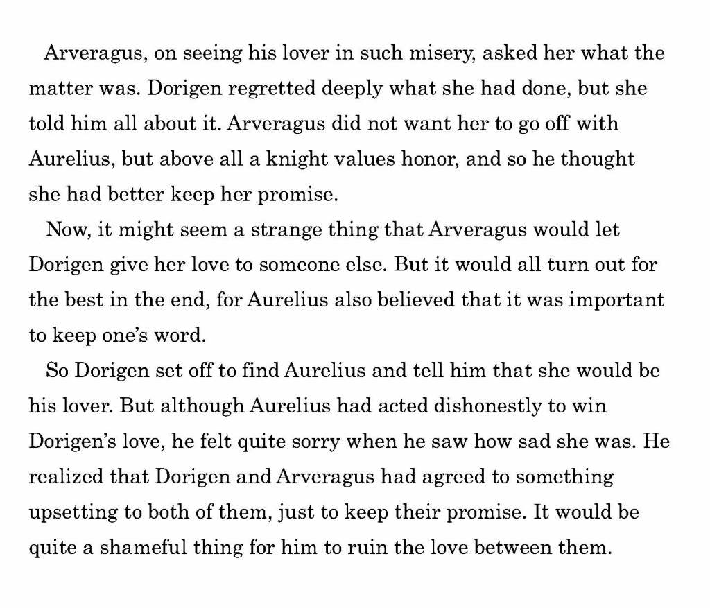 Beyond its visual inclinations, I chose to adapt The Franklin’s Tale on account of its relatively child-friendly story, compared to the other tales we studied. The main complication in its morality is the point of Arveragus giving up his wife to a suitor whom she did not want to be with; even the original tale acknowledges potential audience concern about the knight’s decision, so I have preserved that narratorial comment. Otherwise, Arveragus and Dorigen’s marriage seems far healthier than most other Chaucerian couples; their equal standing and patience with each other translate well into the modern day as moral virtues. In my rendition, the nature of their relationship is more ambiguous, not confirming marital status so as to reduce the complication of the relationships and conflicting promises. I have also tried to clarify the characters’ motivations, contextualizing Arveragus’s actions in his knightly profession, explaining why the rash promises were made, and making clear Aurelius’s moral faults.