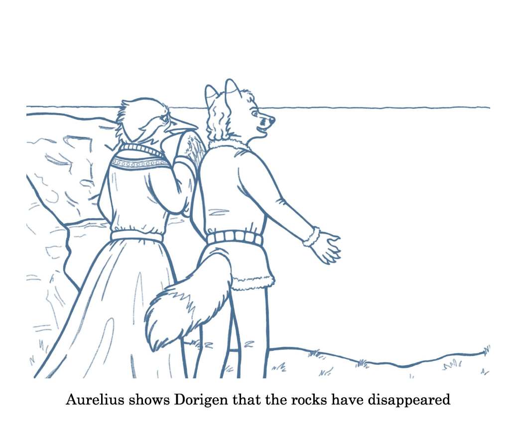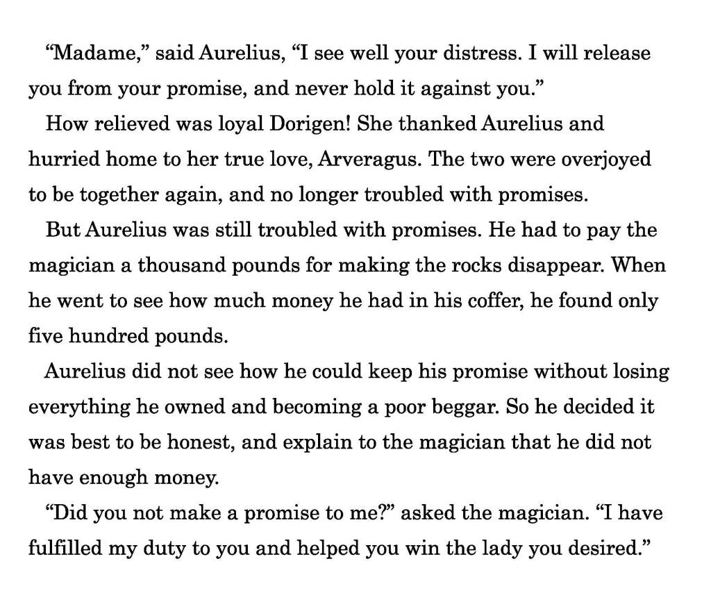 It is customary for children’s adaptations to feature a moral, so this replaced the Franklin’s original concluding question (the suggestion of Arveragus’s “generosity” did not seem appropriate to include). The moral proposed in Mary Eliza Haweis’s Chaucer for Children—which we looked at in class, and which inspired some outfits in my illustrations—was to “beware of the folly that Dorigene committed, in making rash promises”. This makes sense, but it occurred to me that this applied equally to Aurelius, who rashly promised the magician money he could not pay. Thus, I tried to place extra focus on this plot point in my own story, even devoting an illustration to Aurelius’s coffer. Ultimately, neither Dorigen nor Aurelius was punished for their mistake, which I attributed here to their willingness to come clean. This provides for a gentler moral, as naturally children (and all people) will make mistakes; at least there is hope that honesty may alleviate the consequences.
