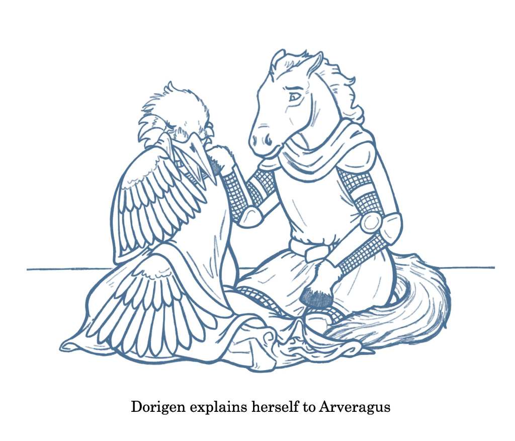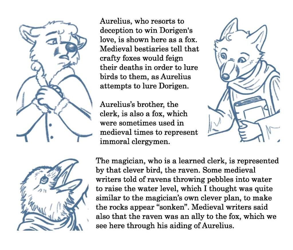 As one whose childhood dream was to be an author-illustrator, I deem no children’s book complete without illustrations, and in fact The Franklin’s Tale lends itself well to this. It is a story about seeing, even when sight does not match up with reality. As the clerk’s magical illusions transform his house into a fantastical forest, a picture book may do similar for a child’s imagination. I hope my illustrations—and the use of animals to differentiate and symbolize characters—might engage readers more in the story’s magic than would the text alone. Pictures can also help to illuminate characters’ emotions and relationships, shown here through expressions and body language.